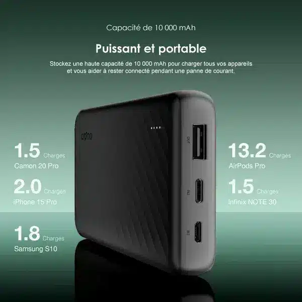 Stockez une haute capacité de 10 000 mAh pour charger tous vos appareils et vous aider à rester connecté pendant une panne de courant.Compatibilité universelle